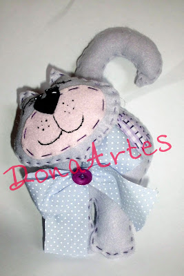 Eu acho esse gato muito lindinho, então resolvi fazer um para a minha filha, mas tive a "brilhante" idéia de pintar a boca e os detalhes dos olhos com tinta de tecido, infelizmente o resultado não ficou o que eu esperava, pois feltro, tinta de tecido e pincel não combinam muito.